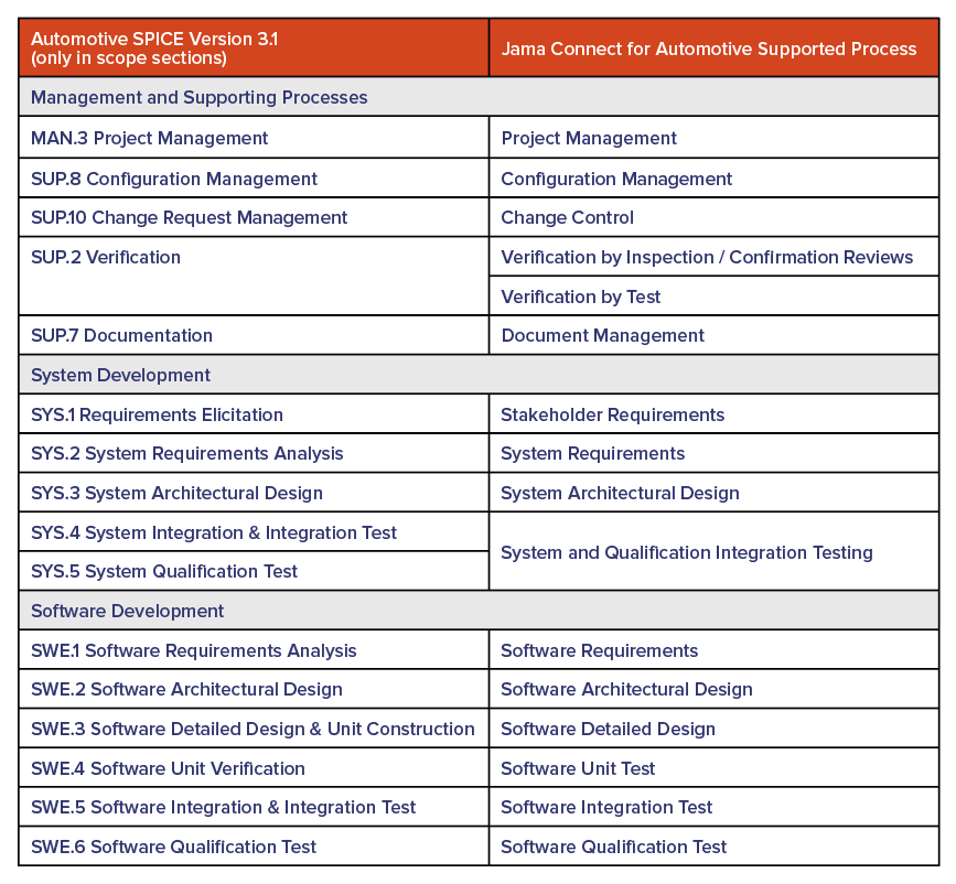 Jama Connect for Automotive includes a fully functional framework that software teams can use to start getting value from Jama Connect for Automotive immediately. The solution also includes complete documentation for how to complete each process most efficiently in Jama Connect for Automotive. Industry-specific Professional Services are also included to guide customers through the inevitable customizations needed by each organization. A complete list of the processes for working in Jama Connect for Automotive that align with ASPICE are listed in the table below.