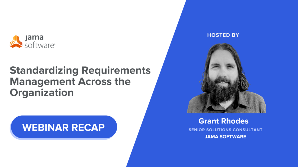 Grant Rhodes: Hello, and thank you all for joining. I’m Grant Rhodes, a Senior Solutions Consultant here at Jama Software. It might be that you are new to the discipline of requirements management, or maybe you have been doing it for many years. Either way, I hope I can provide some value today on the topic of standardizing requirements management within an organization. In my career, working with global teams in many different project settings, I’ve seen the importance of standardization firsthand. Requirements management has proven itself a necessary aspect of product development, reducing defects earlier in the development cycle. Standardization of requirements management processes leads to faster and more complete adoption of those processes and greater collaboration across project teams. On the agenda today, we will talk about how standardizing requirements management processes can benefit your organization, and look at some of the challenges that organizations commonly face when developing a standardized process.