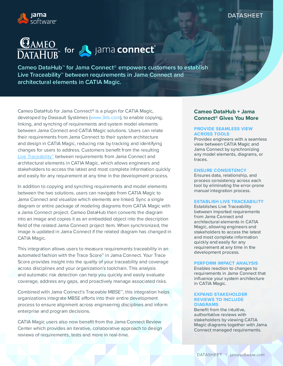 Cameo DataHub for Jama Connect® enables users to relate their requirements from Jama Connect to their system architecture and design in CATIA Magic, reducing risk by tracking and identifying changes for users to address. The resulting Live Traceability™ between requirements and architectural elements allows engineers and stakeholders to access the latest and most complete information quickly and easily for any requirement at any time in the development process.