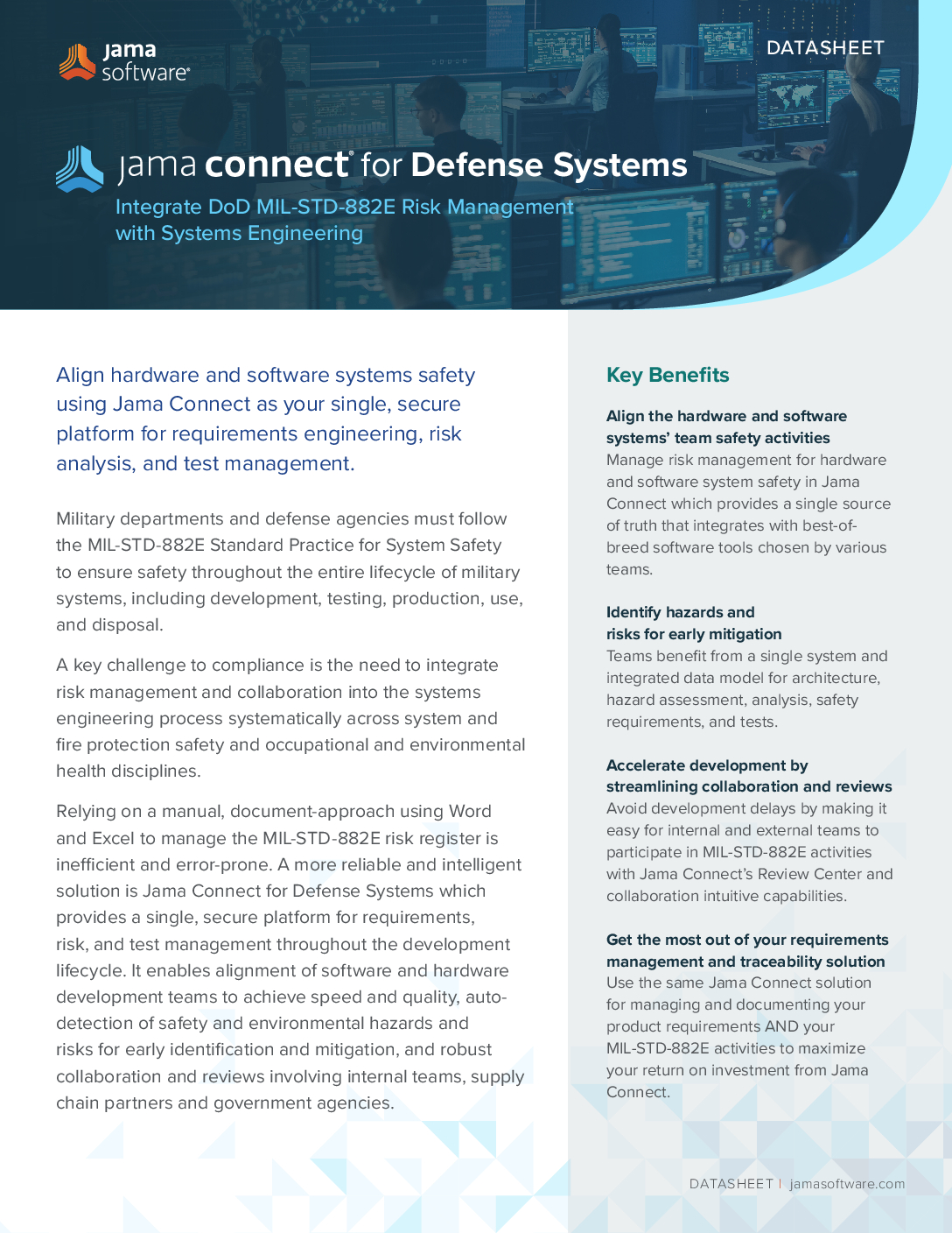 Military departments and defense agencies must follow the MIL-STD-882E Standard Practice for System Safety to ensure safety throughout the entire lifecycle of military systems, including development, testing, production, use, and disposal. A key challenge to compliance is the need to integrate risk management and collaboration into the systems engineering process systematically across disciplines. Relying on a manual, document-approach using Word and Excel to manage the MIL-STD-882E risk register is inefficient and error-prone. Jama Connect® for Defense Systems is your single, secure platform for requirements engineering, risk analysis, and test management.