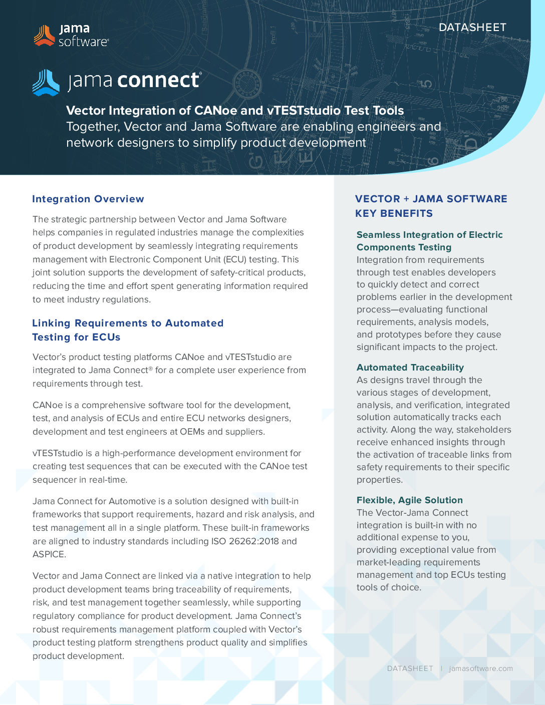 The strategic partnership between Vector and Jama Software helps companies in regulated industries manage the complexities of product development by seamlessly integrating requirements management with Electronic Component Unit (ECU) testing. This joint solution supports the development of safety-critical products, reducing the time and effort spent generating information required to meet industry regulations.
